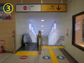 <写真②>の左側の方にある階段出口(昇りエスカレータがある方)<写真③>から駅を出る。