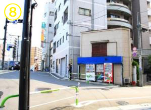 通りの右側に見える建物の1階部分に、ビニールの青い屋根がかかっていて、そのすぐ真下にジュースの自販機が3台並んでいる場所がありますが、その目の前の道を右折して下さい。<写真⑧参照>